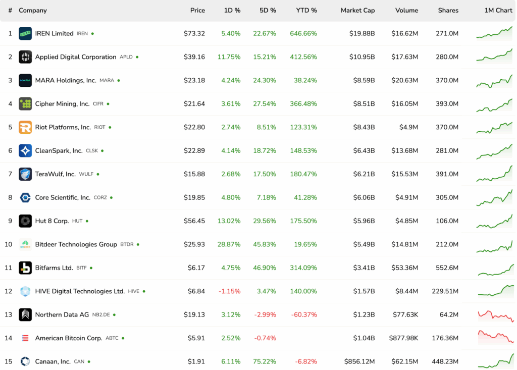 The monthly momentum has spread across nearly the entire Bitcoin mining sector. Iren (IREN) recently rose sharply following the close of a $1 billion convertible note offering and two major price target hikes.