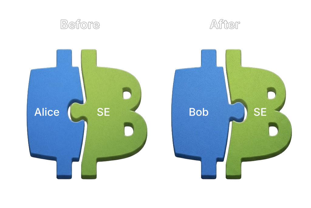 Initially, Alice holds a puzzle piece that matches the piece held by the SE. She can spend her bitcoins by combining the pieces and completing the puzzle. When Alice wants to send her bitcoins to Bob, she allows Bob to create a new puzzle together with the SE. Importantly, the puzzle itself doesn’t change: the old and new puzzle have the same shape, but the pieces that compose it change. The new puzzle is designated for Bob: one side is associated with Bob and the other with the SE. From that point on, only Bob’s piece matches the SE’s piece. Alice may still retain her old puzzle piece, but it’s now useless. Since the SE destroyed its matching piece, Alice’s piece no longer fits any other piece and cannot be used to spend the bitcoin. Ownership has effectively moved to Bob, even though the bitcoin in question never moved on-chain.