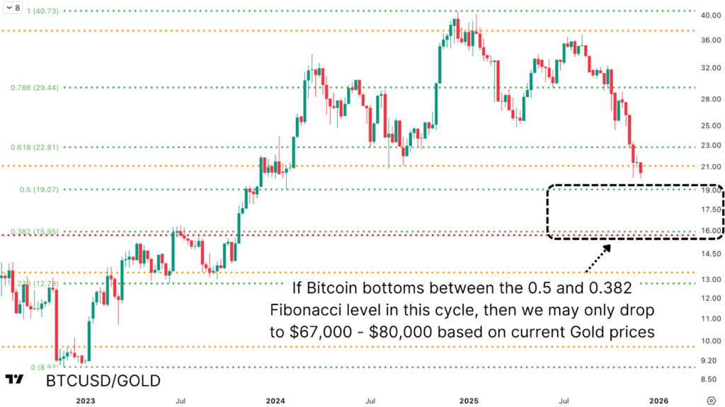 Multiple Fibonacci levels from different cycles create additional confluence. The 0.786 level from the current cycle translates to approximately 21.05 ounces of Gold, corresponding to a Bitcoin price around $89,160. The 0.618 level from the previous cycle aligns near $80,000 again. These convergence zones suggest that if Bitcoin were to decline further, the next meaningful technical target would be around $67,000, derived from the 0.382 Fibonacci retracement level at approximately 15.95 ounces of Gold per Bitcoin.