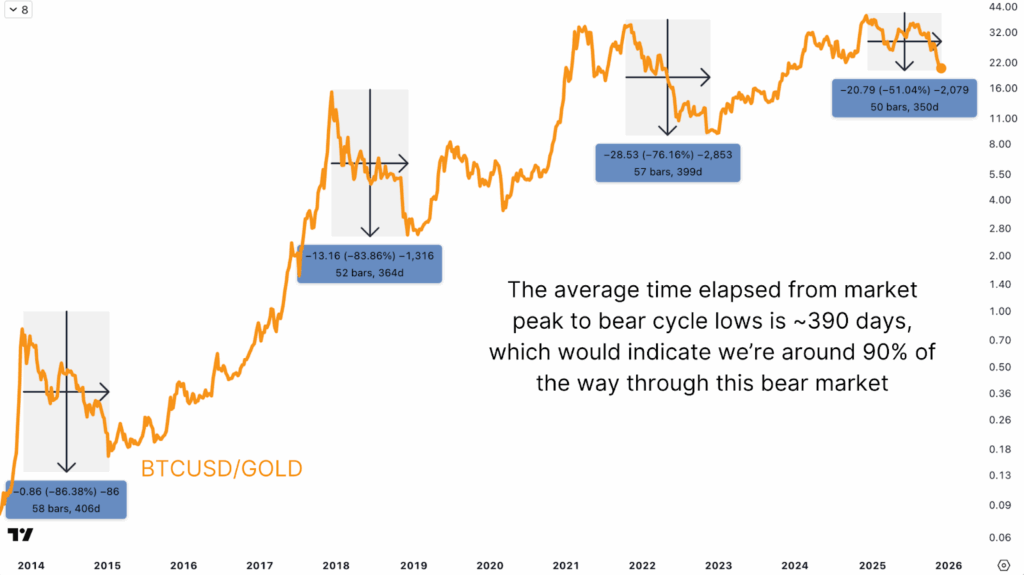 Bitcoin has struggled to maintain a sustained correlation with Gold, recently only moving in unison during market downturns. However, examining Bitcoin’s price action through the lens of Gold rather than USD reveals a more complete picture of the current market cycle. By measuring Bitcoin’s true purchasing power against comparable assets, we can identify potential support levels and gauge where the bear market cycle may be approaching its conclusion.