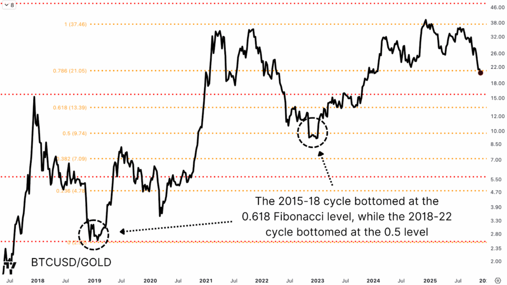 In the 2015-2018 cycle, the bear market bottom occurred at the 0.618 Fibonacci level, which corresponded to approximately 2.56 ounces of Gold per Bitcoin. The resulting price action marked the bottom with remarkable clarity, far cleaner than the equivalent USD chart. Moving forward to the 2018-2022 cycle, the bear market bottom aligned almost perfectly with the 0.5 level at approximately 9.74 ounces of Gold per Bitcoin. This level later acted as meaningful resistance-turned-support once Bitcoin reclaimed it during the subsequent bull market.